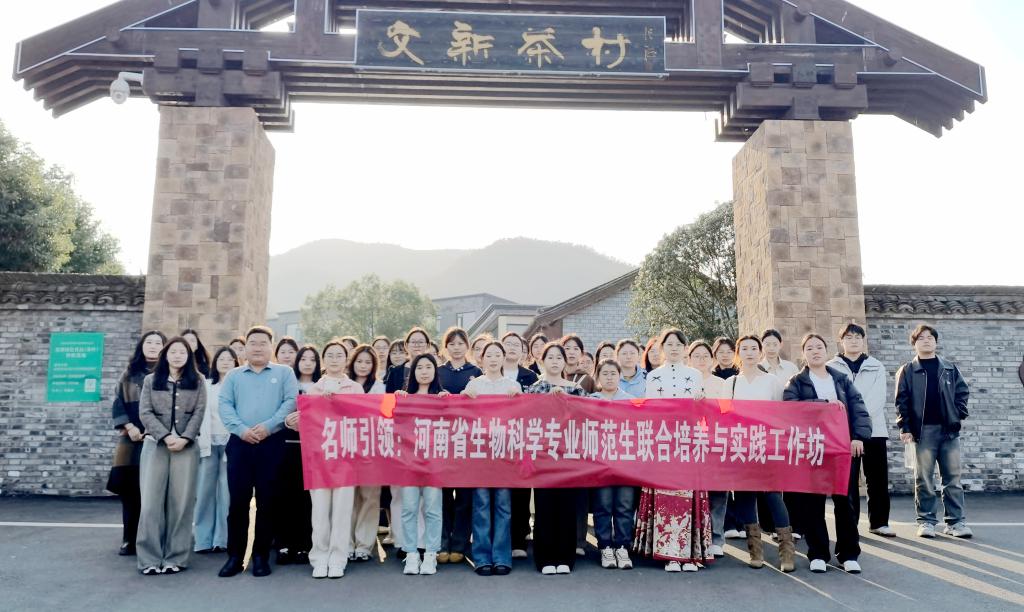 11月16日,我院河南省生物科学专业师范生联合培养与实践工作坊组织生物科学专业59名师生,到信阳市浉河区文新茶村,开展了一场融合茶文化体验、乡村振兴调研与茶树种质资源科学考察的实践活动。本次活动由张伟老师带队,通过“名师力行”社会实践,将《植物学》《遗传学》《生态学》等专业课程知识与田野实践深度融合,提升学生的综合素养与科学探究能力。