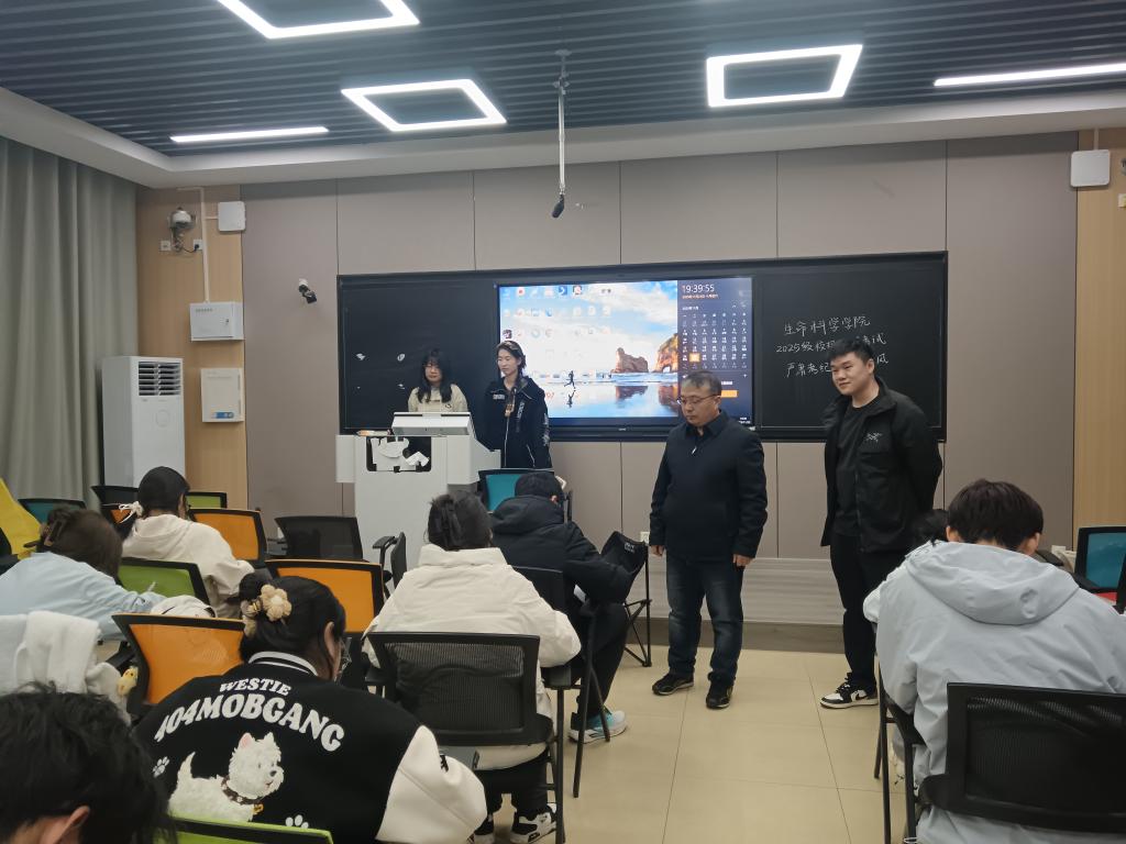 考试过程中,考场秩序井然,新生们认真审题、规范作答,展现出良好的学习态度与纪律素养。荣宪举副书记与张博辅导员逐考场巡查,仔细查看考生答题情况,提醒大家遵守考试纪律,同时关注考场环境,确保考试公平公正进行。