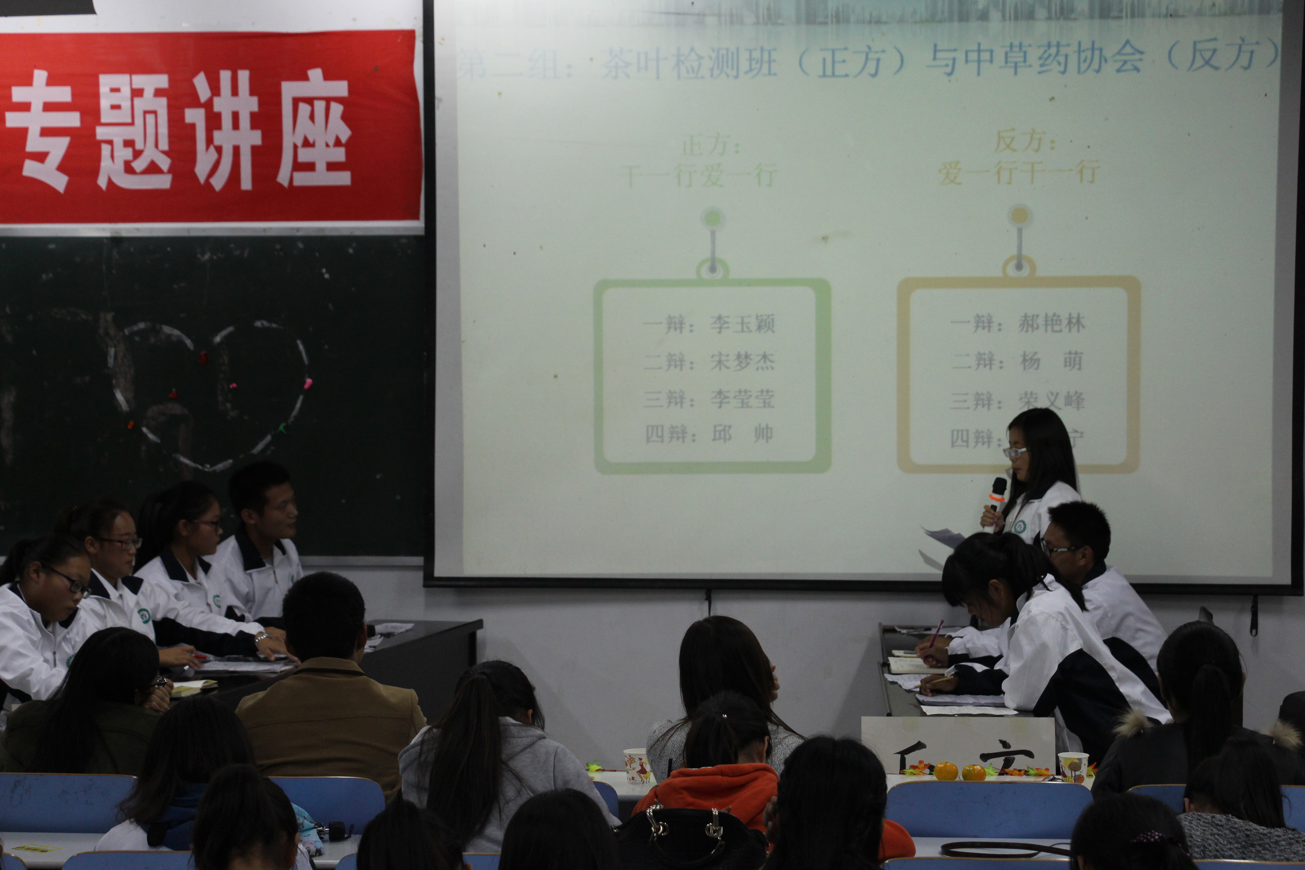 本次决赛分为两场,分别围绕“网络拉近还是疏远人与人之间的距离”和“干一行爱一行还是爱一行干一行”两个辩题展开辩论。第一场辩论中,由团总支学生会代表组成的正方对战反方生物科学1班。正方以“网络交流,遍布全球,突破时空限制,传递真挚感情”为中心的开篇立论阐明己方观点。面对对方有理有据的陈词,反方也不甘示弱,用大量的现实事例表明“网络交往毕竟是虚拟的,拉近的并不是人与人之间的距离,而是人与电脑等网络工具的距离”,以客观的态度、严谨的论证对正方予以反击。第二阶段的攻辩环节,双方更是针锋相对,互不相让,迅速调动现场的气氛。到了最精彩的自由辩论环节,双方分别拿出赛前充分准备、精心组织的问题进行发问,两方辩手也是谨慎回答,始终坚持本方观点,驳斥对方观点。无论是正方还是反方,都全神贯注地倾听对方的回答,巧妙地揪出对方的漏洞,予以反击,使对方手足无措。辩手们一个个妙语连珠、娓娓而谈,赢得观众阵阵掌声。最后一个环节的总结陈词,双方四辩先对对方之前的论点进行驳论,再对己方观点总结陈述。第二场的辩论中,正方生物技术(茶叶检测)班对战反方中草药协会。辩手们更是旁征博引,唇枪舌战,进行了激烈的交锋。最终,2015级生物技术(茶叶检测)班夺得冠军。