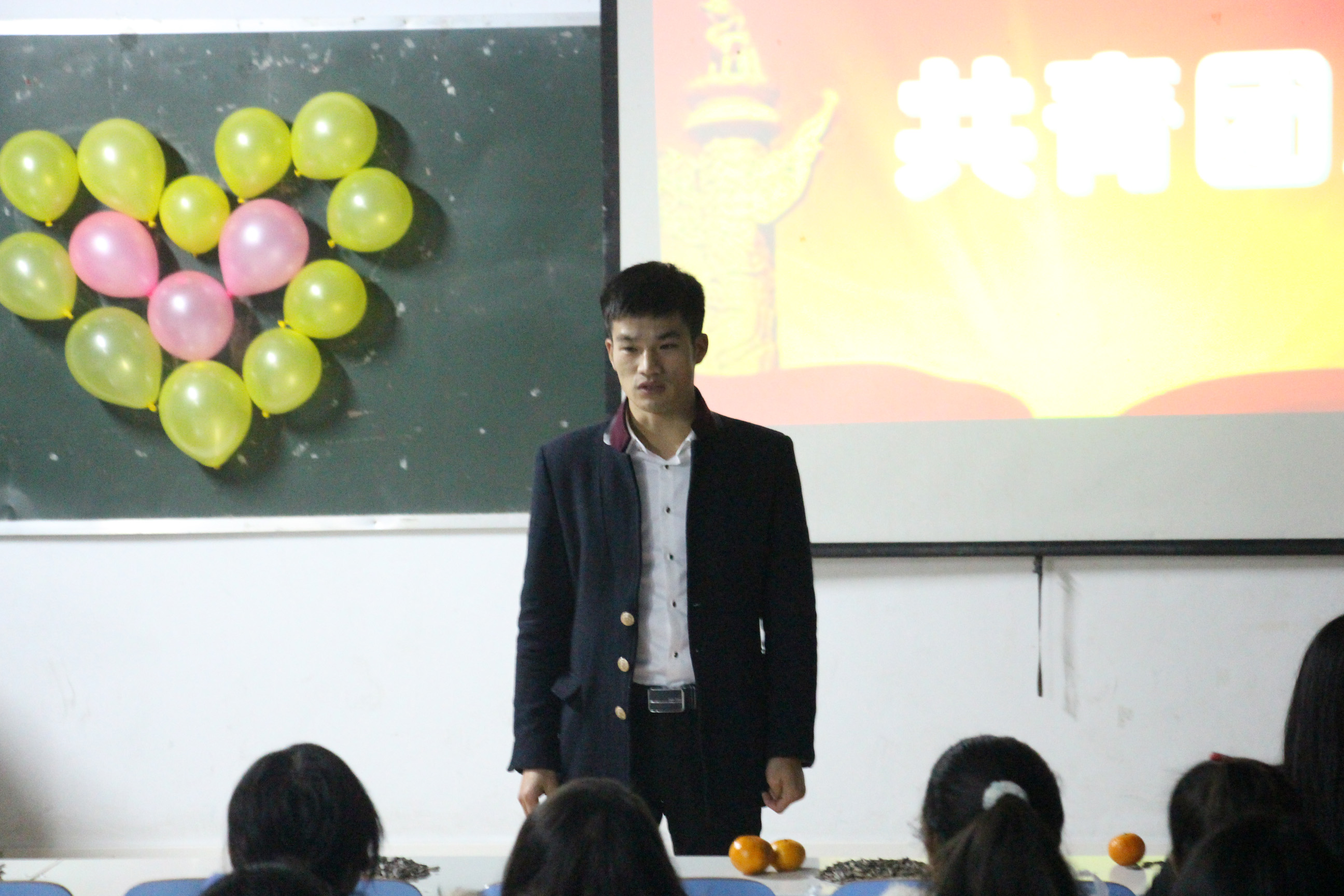 全体人员齐声唱出《光荣啊,中国共青团》后,活动拉开帷幕。随后,小品、话剧、哑剧、朗诵、演讲、歌舞各类节目精彩纷呈,内容新颖活泼,趣味十足。其中哑剧《盖章》,仅以诙谐幽默的肢体语言,就生动形象地揭露了贪官污吏们“拿钱才办事”的丑恶嘴脸。精彩的节目之间还穿插了团知识提问环节,不仅调动了全场氛围,而且增加了观众们对团知识的了解。晚会接近尾声,全班同学合唱《歌唱祖国》。最后,孙太红老师对活动进行总结。他指出,本次活动采用与众不同的形式增加了同学们对中国共青团的了解,值得学习和赞扬,希望新生团员通过活动增强团员意识,提升开展团的工作能力。
