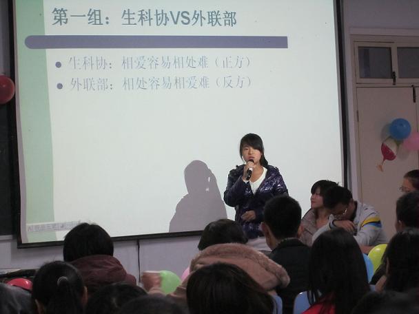 本次比赛共分为两场进行,经过激烈的初赛,四个进入决赛的小组已然信心十足,准备对决。在生科院学生会外联部与生命科技协会的队员简短的自我介绍后,第一场辩论赛就此拉开战火。首先辩论赛正反双方的第一辩手开始了开篇立论,正方一辩从爱的对象、爱的心理以及相处的方式、结果等方面论证了“相爱容易相处难”的观点。反方一辩则从相处的长久性、交流的方式和爱的磨难来阐述“相处容易相爱难”的观点。在随后的提问环节中,正反双方激烈辩答,充分展现了大学生流利的语言表达能力及敏捷的反应能力。同时在自由辩论时,辩手们缜密的逻辑推理,出色的辩驳能力和口才令全场观众为之折服,掌声、呼叫声接连不断。最后四辩发表了精彩的结束辩语。在第一场精彩的辩论后,由生科一班和生物制药班的精彩对决也就此展开,辩手就代沟的主要责任在于父母还是孩子进行激烈的辩论。他们思维活跃,技巧灵活,出色的反应能力赢得了阵阵掌声。经过四个组的精彩对决后,生科院学生会外联部以出色的表现夺得了此次辩论赛的冠军。