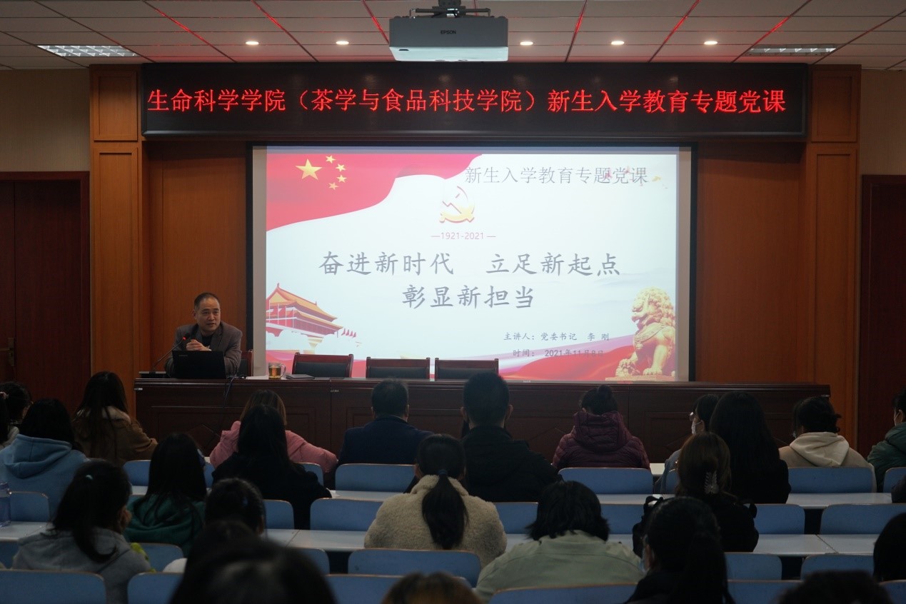 为深入学习贯彻习近平新时代中国特色社会主义思想,扎实推进党史学习教育走深走实,引领广大新生厚植爱党爱国主义情怀,帮助扣好人生“第一粒扣子”,11月10日晚7点,royal88手机登录(茶学与食品科技学院)党委书记李刚于生科楼414多媒体报告厅开讲“奋进新时代 立足新起点 彰显新担当”专题党课,带领全体辅导员和2021级新生班干部及学生会干事在重温党史故事、感悟信仰力量中学史明理、学史增信、学史崇德、学史力行。会议由学院党委副书记荣宪举主持。